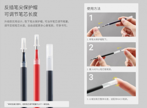 更为贴心的是,KEFILL 双珠笔芯可以适配绝大多数 KACO 的中性笔款。通过添加尾塞●,可以适配其他品牌的中性笔款,让笔款择更多的由使用者自由挑选。