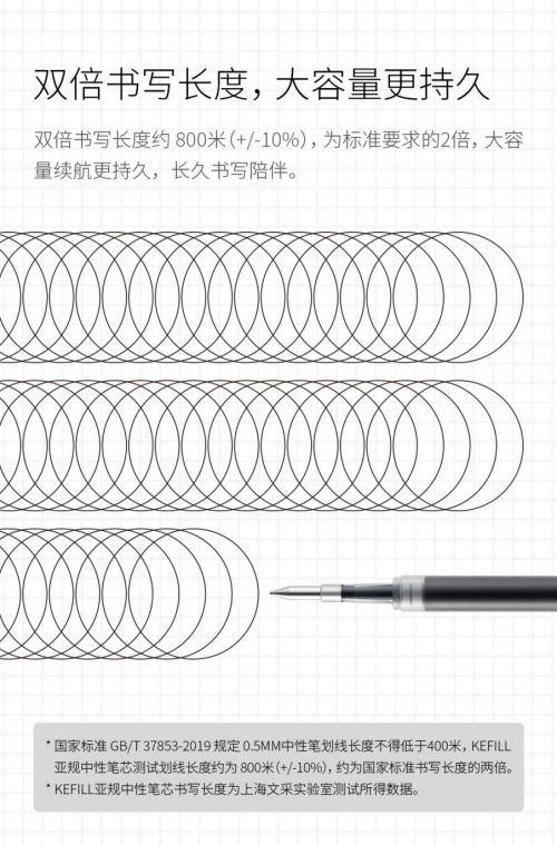 在笔芯装配层面,KEFILL 双珠笔芯在常规生产工序中,额外增添了检测工艺,降低笔芯的漏墨风险。书写长度达到约800米(+/-10%),为标准书写长度的2倍。大容量更持久=☆▲,灵感不断,书写就不断。颜料型墨水,让书写落笔快干,不易晕染。保证书写的整洁美观。