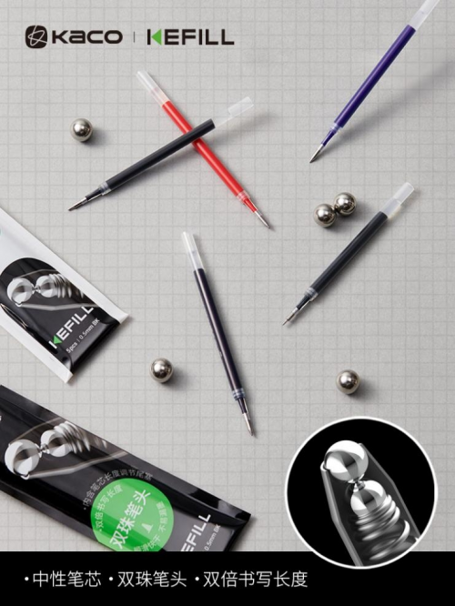 另一方面,双珠笔头球珠和球座上导墨槽的接触面相对较小,从而降低了之间的摩擦力★●,提升了书写的顺滑度。同时,为了保证书写时不断墨●,KACO内部通过大量测试,调整了两颗球珠的直径-,搭配和科研院所合作设计出的新配方碳化钨合金球珠,保证KEFILL双珠笔芯在常用纸张上书写更加不易断墨。
