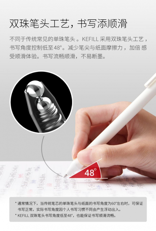 同时■○,KEFILL双珠笔芯采用瑞士进口的24工位单循环笔头加工机生产▼△,对关键部位增加精加工工序,尤其是收口工序,采用2道收口工艺○••,用弧形收口方式●,让书写角度控制小于48°,减少小角度书写时笔头碗口与纸面摩擦力◁▪□,让书写既顺滑又省力●。