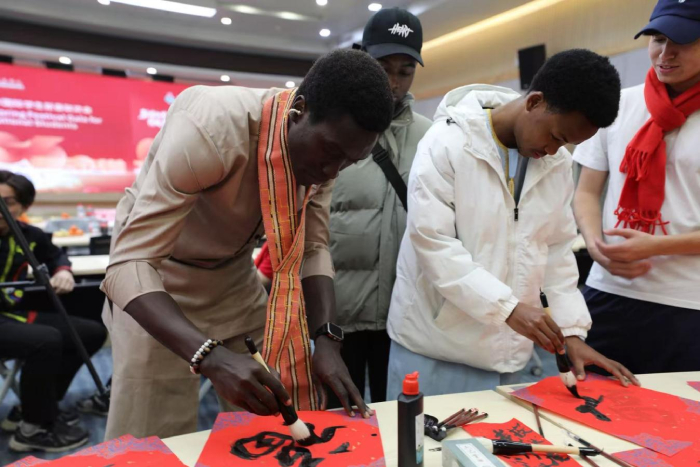 互动游戏环节,踢毽子、趣味飞镖、知识抢答等项目让中外师生其乐融融,现场气氛热烈非凡。 活动前,学校设置毛笔字书写、剪纸等传统文化体验环节,让留学生沉浸式感受中国年俗魅力。